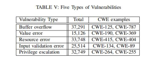 实验设计:作者借助CWE漏洞分类系统,把漏洞数据分成5类(见表 V)。然后,使用多个DLM来检测这 些漏洞,从而对比它们在不同漏洞类型上的表现。为了减少偏差,研究人员进行了交叉验证。具体的分类包括:缓冲区溢出(Buffer overflow)、值错误(Value error)、资源错误(Resource error)、输入验证错 误(Input validation error)、特权升级(Privilege escalation)。