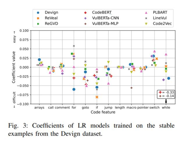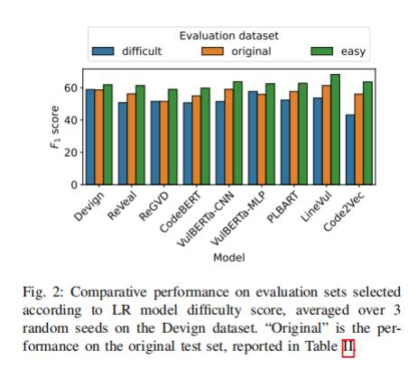 实验设计:首先,研究人员将Devign数据集分为易于处理和难以处理的两个子集。然后使用一个基于逻辑回归(Logistic Regression)的模型公式来计算每个函数的难度得分,并将其用作选择简单和困难训练和测试样本的依据。接下来,研究人员对数据进行了特征提取,并使用了一些常见的代码特征(如控制流结构、字符串操作等)。最后,他们使用了5折交叉验证(5 fold cross validation)来评估不同深度学习模型在Devign数据集上的性能,并比较了它们在易/难子集上的性能差异。