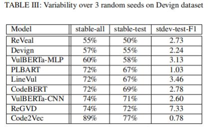 实验设计:实验人员在Devign数据集上使用三个不同的随机种子对11种DLM模型进行训练,然后测量它们在漏洞检测方面的性能,并比较它们之间的一致性。作者测量了在所有三个随机种子下具有相同二进制标签的输入所占的百分比,并将其称为“稳定输入”。然后,作者比较了这些稳定输入在不同模型之间的一致性。
