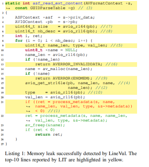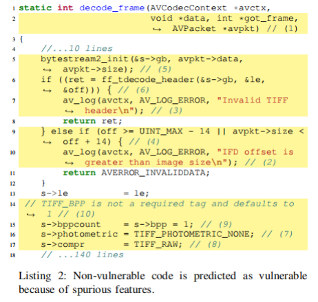 有趣的是,Transformer架构模型有时不依赖漏洞的实际原因来进行预测。此结论的支撑是:因为Transformer模型采用固定大小的输入,有时会截断一些关键代码,包括可能是根本原因的代码。但模型仍 然可以获得高分F1分数来预测漏洞。作者展示了一个代码示例(Listing 1),虽然模型的预测结果是正确的,但使用的特征点并不是造成漏洞的实际原因。