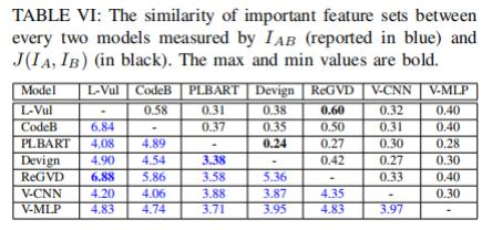 研究发现:尽管不同模型在个别预测上可能存在很大分歧,但它们所使用的代码信息却有很大重叠。所有模型对于重要特征都至少有3行相同代码(表 VI)。其中,Linevul和ReGVD在重要特征集合方面具有最高的相似性,平均共享6.88行代码。而Devign作为唯一基于属性图(property graph)的GNN模型,则与其他模型具有较低的重叠性,与PLBART之间的平均重叠率最低,仅为3.38行。