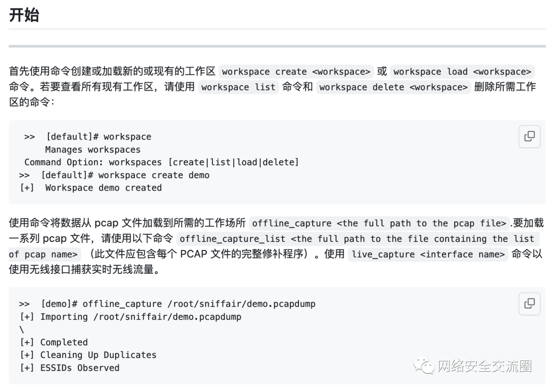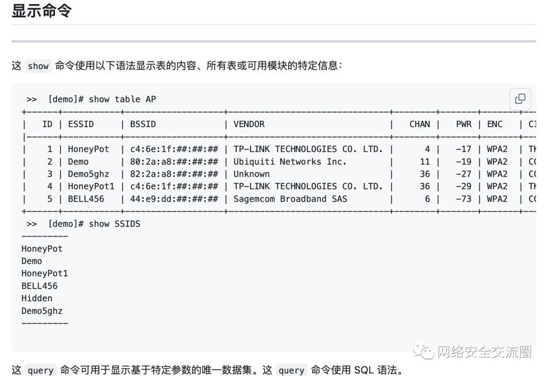 use <module name> 命令。对于某些模块,可能需要设置其他变量。可以使用 set 命令设置它们 set <variable name> <variable value>:>> [demo]# show modulesAvailable Modules=================[+] Auto EAP - Automated Brute-Force Login Attack Against EAP Networks[+] Auto PSK - Automated Brute-Force Passphrase Attack Against PSK Networks[+] AP Hunter - Discover Access Point Within a Certain Range Using a Specific Type of Encrpytion[+] Captive Portal - Web Based Login Portal to Capture User Entered Credentials (Runs as an OPEN Network)[+] Certificate Generator - Generates a Certificate Used by Evil Twin Attacks[+] Exporter - Exports Data Stored in a Workspace to a CSV File[+] Evil Twin - Creates a Fake Access Point, Clients Connect to Divulging MSCHAP Hashes or Cleartext Passwords[+] Handshaker - Parses Database or .pcapdump Files Extracting the Pre-Shared Handshake for Password Guessing (Hashcat or JTR Format)[+] Mac Changer - Changes The Mac Address of an Interface[+] Probe Packet - Sends Out Deauth Packets Targeting SSID(s)[+] Proof Packet - Parses Database or .pcapdump Files Extracting all Packets Related to the Inscope SSDIS[+] Hidden SSID - Discovers the Names of HIDDEN SSIDS[+] Suspicious AP - Looks for Access Points that: Is On Different Channel, use a Different Vendor or Encrpytion Type Then the Rest of The Network[+] Wigle Search SSID - Queries wigle for SSID (i.e. Bob's wifi)[+] Wigle Search MAC - Queries wigle for all observations of a single mac address>> [demo]#>> [demo]# use Captive Portal>> [demo][Captive Portal]# infoGlobally Set Varibles=====================Module: Captive PortalInterface:SSID:Channel:Template: Cisco (More to be added soon)>> [demo][Captive Portal]# set Interface wlan0>> [demo][Captive Portal]# set SSID demo>> [demo][Captive Portal]# set Channel 1>> [demo][Captive Portal]# infoGlobally Set Varibles=====================Module: Captive PortalInterface: wlan0SSID: demoChannel: 1Template: Cisco (More to be added soon)>> [demo][Captive Portal]#