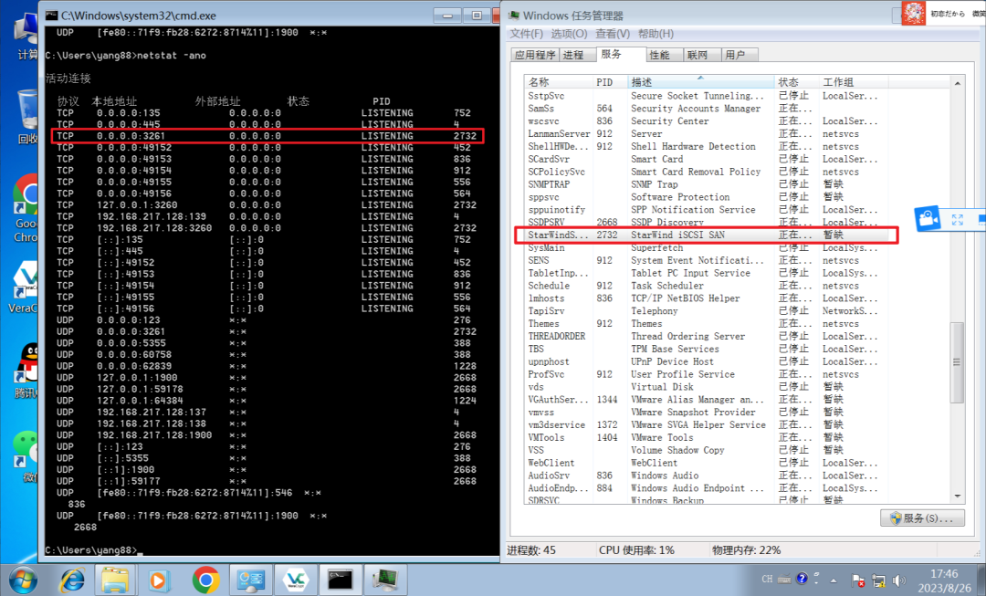 taskmgr锁定iSCSI服务器进程PID,然后通过netstat -ano查看端口