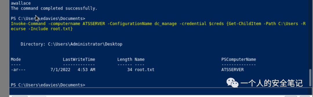 PS C:\Users\edavies\Documents> Invoke-Command -computername ATSSERVER -ConfigurationName dc_manage -credential $creds {ls 'c:\program files\Keepmeon\'}最终使用 awallace 账号成功已域管理员身份读取到 Administrator 目录的 root flag。