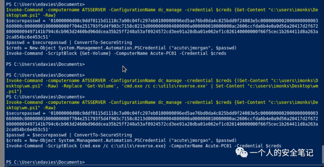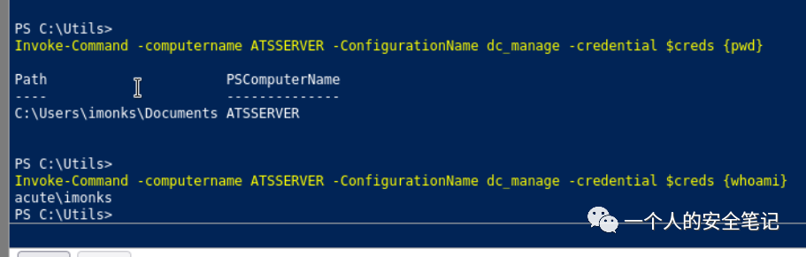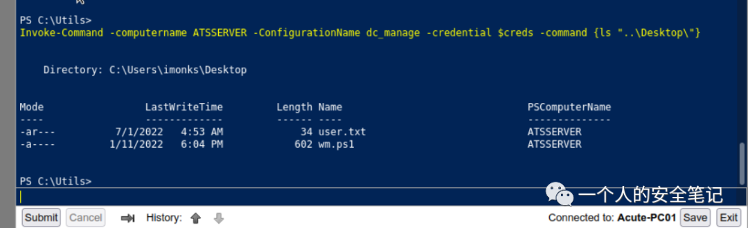 Invoke-Command -computername ATSSERVER -ConfigurationName dc_manage -credential $creds {pwd}可以看到在 imonks 用户下除了 user.txt 文件,还存在一个 wm.ps1 脚本。
