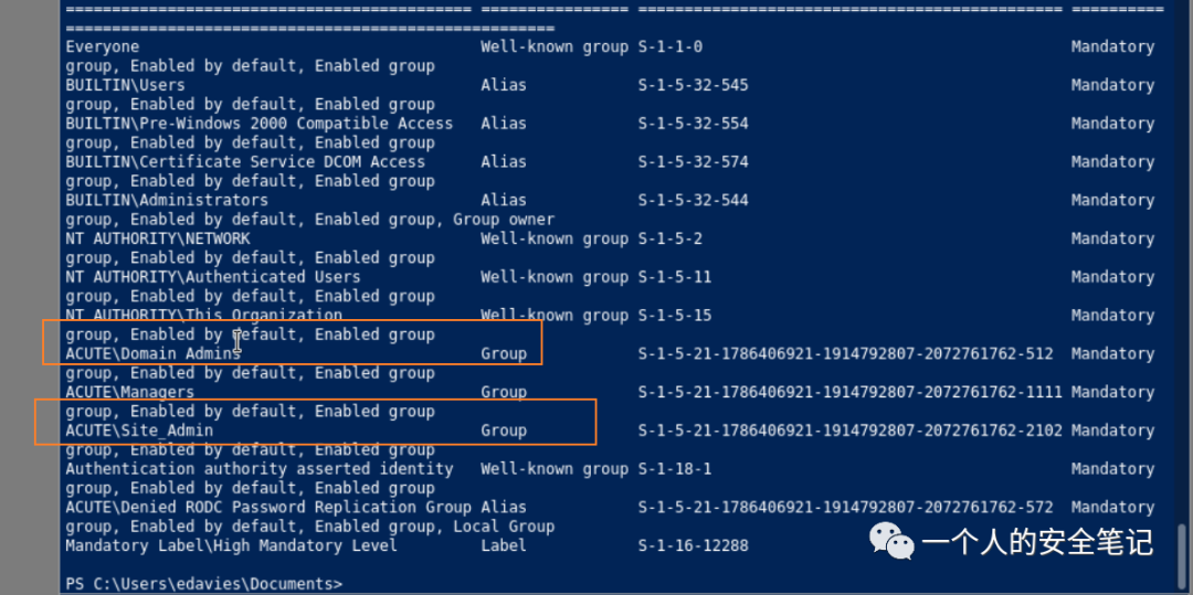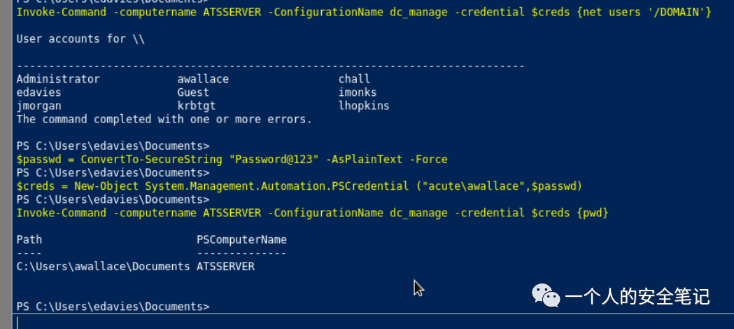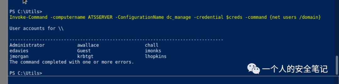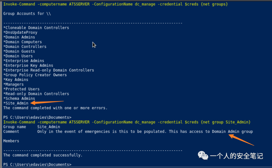 Invoke-Command -computername ATSSERVER -ConfigurationName dc_manage -credential $creds {pwd}查看下用户所属组,含 Domain Users、Managers 两个组。
