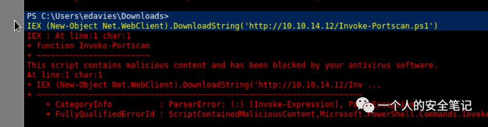 尝试将 nishang 中端口扫描脚本传递至目标服务器,失败了。从错误提示中可以看到被 Windows Defender AV 阻断了,这里我没需要进行 bypass。