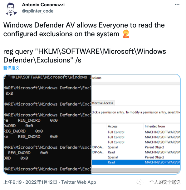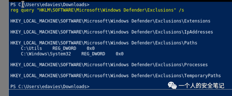 Windows Defender AV 允许每个人读取系统上配置的排除项.reg query "HKLM\SOFTWARE\Microsoft\Windows Defender\Exclusions" /s