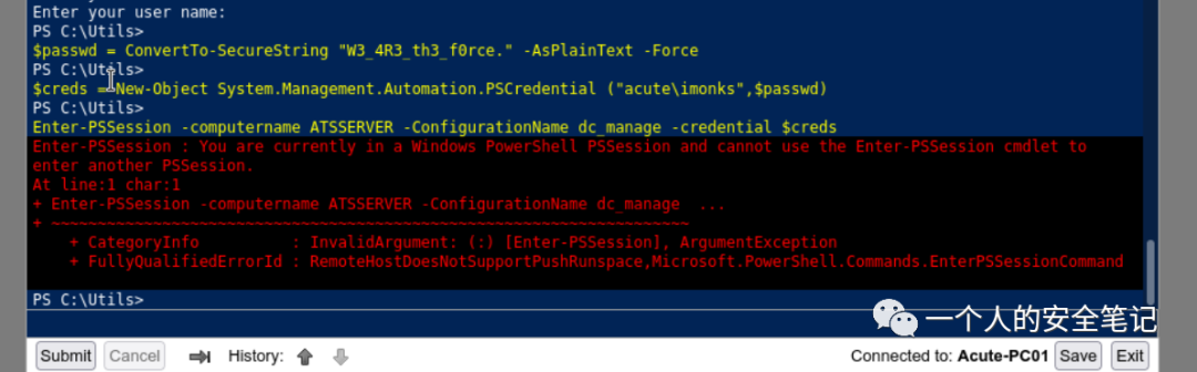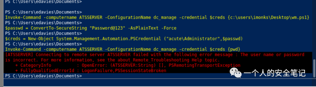 Enter-PSSession -computername ATSSERVER -ConfigurationName dc_manage -credential $creds可以看到,在执行最后一段内容时出现错误:访问被拒绝。这意味用户账号无权限创建从当前主机到目标主机的远程 PowerShell 会话,怀疑是配置权限问题。