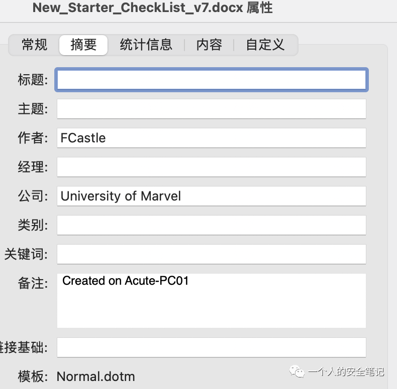 密码有了开始找用户名,使用 exiftool 工具可以看到文档创建者为:FCastle,其中备注信息中含有机器名:Acute-PC01。当然,在 Word 文档属性中也能得到这些信息。