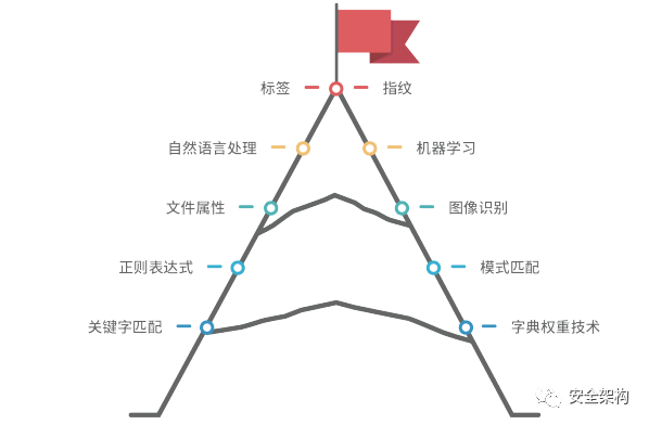 数据识别技术是 DLP 解决方案中使用各种技术分析深层内容的能力。当前全球主流 DLP 产品所支持的数据识别技术根据其匹配敏感信息的精准程度,至下而上依次为:关键字识别、字典权重识别、正则表达式识别、文件属性识别、图像内容识别、自然语言分析处理、标签识别、机器学习识别 和 指纹识别 共计 9 种。检验 DLP 产品是否具有完备及可用的数据识别技术是检验 DLP 产品最核心的功能指标。
