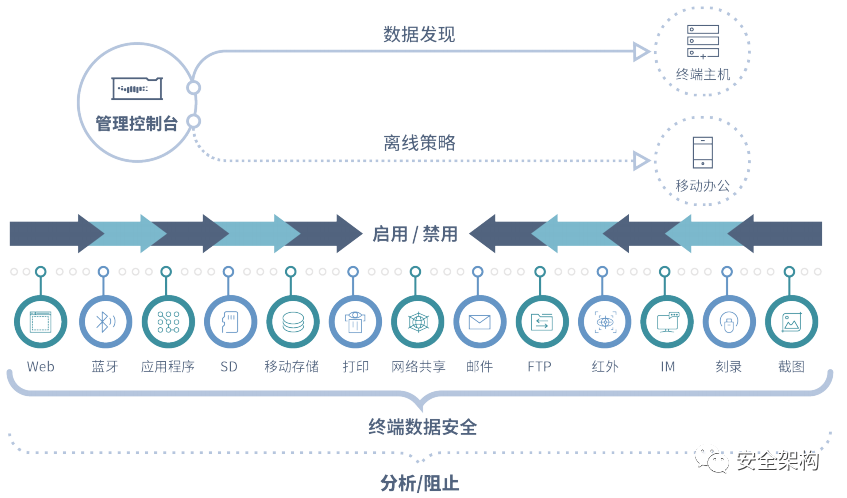 如下图所示:全套 DLP 解决方案需要提供对整个组织的网络、邮件、数据库、移动应用、端点、内部业务应用的全面覆盖。