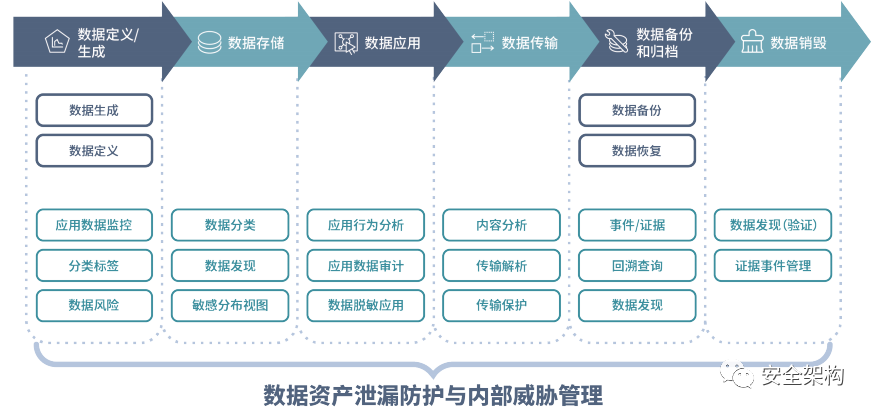 数据防泄露贯穿于数据生命周期的全过程。从数据的生成开始,到数据的存储、应用、传输、备份归档到数据的销毁,每一个步骤都有相应的数据防泄露技术作为支撑。
