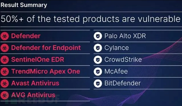 研究人员共测试了11款杀毒软件,除了微软,SentinelOne、Avast、AVG、趋势科技等厂商产品均受此漏洞影响。