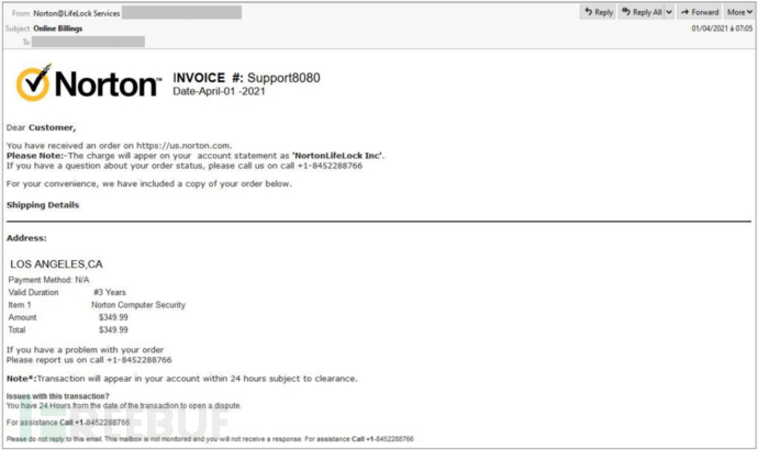 2021年3月,电子邮件安全公司 Vade Secure曾揭露一系列冒充微软、诺顿、迈克菲等知名安全厂商的账单邮件,诱导用户以300多美元的价格订阅相关安全服务。当用户根据邮件中的电话联系对方并根据给到的网址进行购买后,会说服用户以远程访问的方式对系统进行检测,期间会检测出大量虚假威胁,并以此为由安装能够长期远程操控用户设备的软件,如部署恶意软件或将设备纳入不法分子的垃圾邮件僵尸网络。