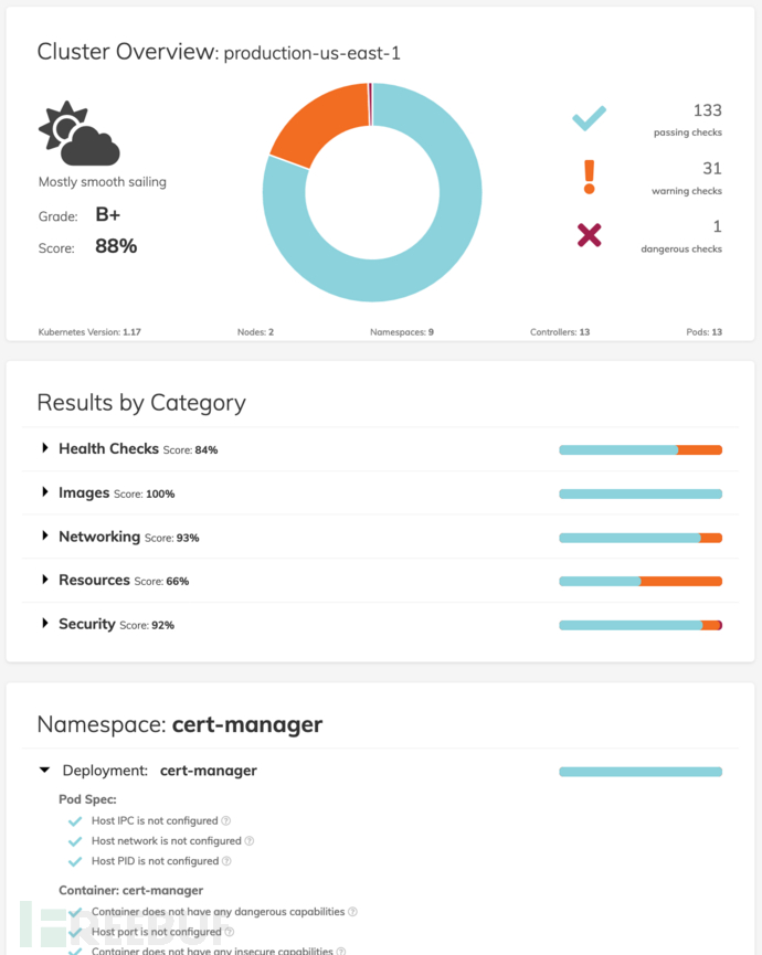Polaris仪表板可以简单直观地了解Kubernetes工作负载的当前状态,以及可以改进的路线图。仪表板提供了集群范围的概述,以及按类别、命名空间和工作负载划分结果: