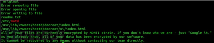 同样值得注意的是,MONTI Locker能够在受影响的服务器上更新MOTD文件(每日消息)。例如,这个文件(/etc/motd)控制用户登录到vCenter时看到的内容。感染后,使用MONTI Locker加密的服务器将显示配置的赎金通知。
