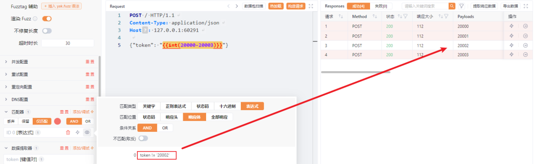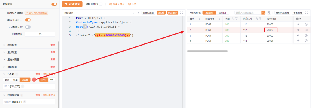 // 使用 {{int(20000-20003)}} 会发送四个包for req in [req1 , req2 , req3 , req4]{    rsp,_ = poc.HTTP(req)~    // 提取器 从 body 中提取 {"token":"20000"} 的值    token = 键值对提取器(rsp.body,"token") // token = "20002"    // 匹配器 使用我们输入的表达式    if 表达式匹配器(`token == "20002"`){        println("匹配成功")    }}