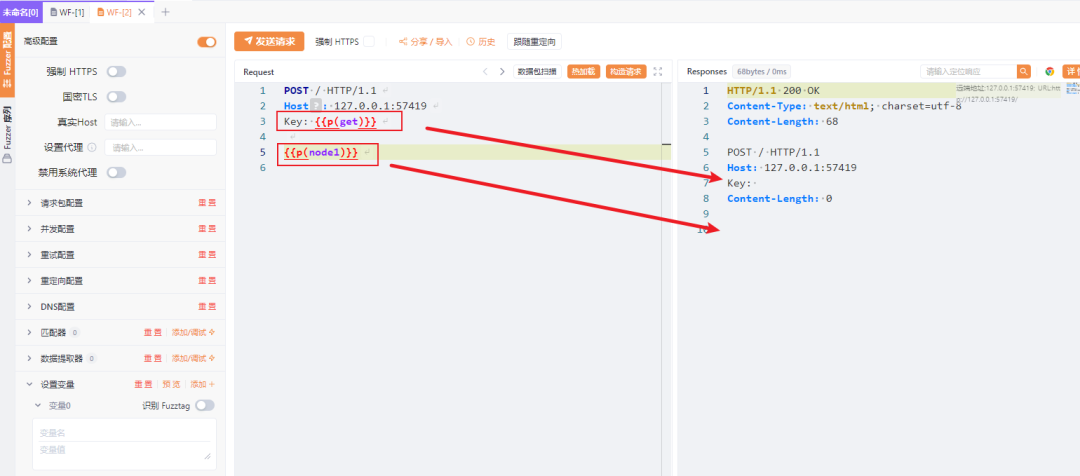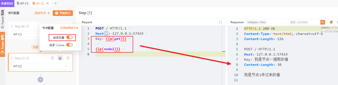 那么我们使用 Fuzzer 序列功能尝试一下,在 WF-[1]WF-[2]的中间,开启继承变量(默认都是开启的),查看结果,WF-[2]已经完美继承了在WF-[1]中设置的功能了