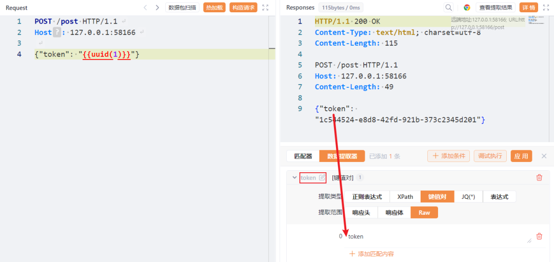 解释一下我们设置的提取器,首先我们把原来的 data_0变量名修改为了token,其次我们的提取类型为键值对,提取范围为 Raw,也就是将提取的范围限定为整个返回包,最下方的 token则是特定键名了,我们通过token这个键名就可以获取到1c544524-e8d8-42fd-921b-373c2345d201的值了,点击调试执行,看看结果是否复合预期。