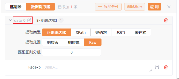 数据提取器的规则设置完毕了,接下来就是用匹配器来验证我们上面声明的变量是否可以使用了,我们设置一个如下的匹配器规则: