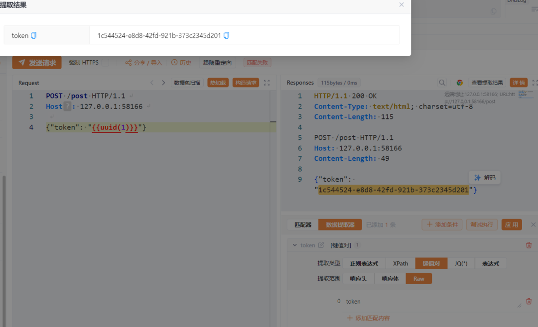 我们发送一下请求,查看结果发现,匹配器成功的使用了提取器的获取的值进行了表达式的判断