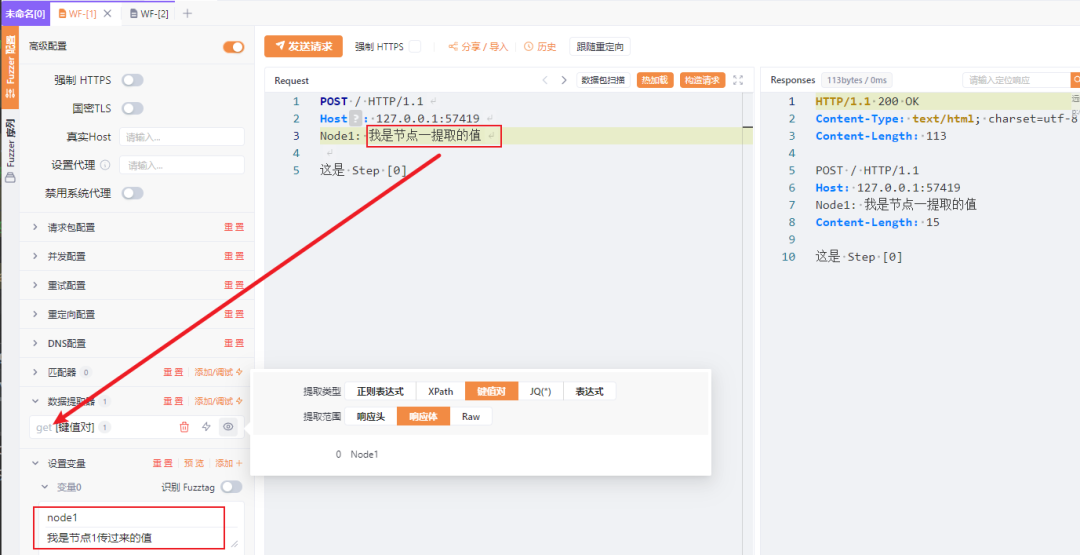 随后我们在 WF-[1]中设置一个提取器规则,规则内容是提取键值为Node1的值,声明为 get变量