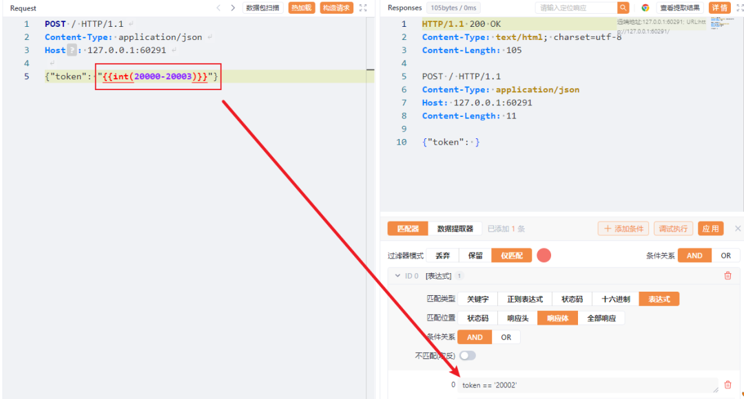 在这个匹配器规则中,我们选择了使用变量配合表达式语句进行匹配,箭头指向的 token就是我们在上一步中声明的变量(token),那么这个匹配器规则配合之前的提取器规则的伪代码如下: