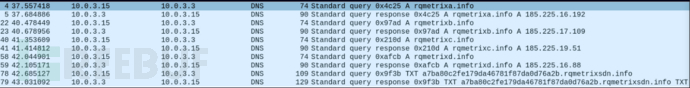 最后,如果此enum值等于4(上面注释为GET_DOMAIN_DNS_TUNNEL_BACKUP),那么恶意软件会诉诸备份计划,并试图通过与一个不同的服务器(rqmetrixsdn.info)协商,通过TXT DNS隧道查询获得域名,如流量捕获中所示。