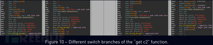 函数get_c2_domain接收一个枚举参数(这里在寄存器edx中传递)。值0、1、2和3分别导致函数解密并返回每个恶意软件的硬编码C&C域名——在本例中是rqmetrixa.info、rqmetrixb.info、rqmetrixc.info、rqmetrixd.info。