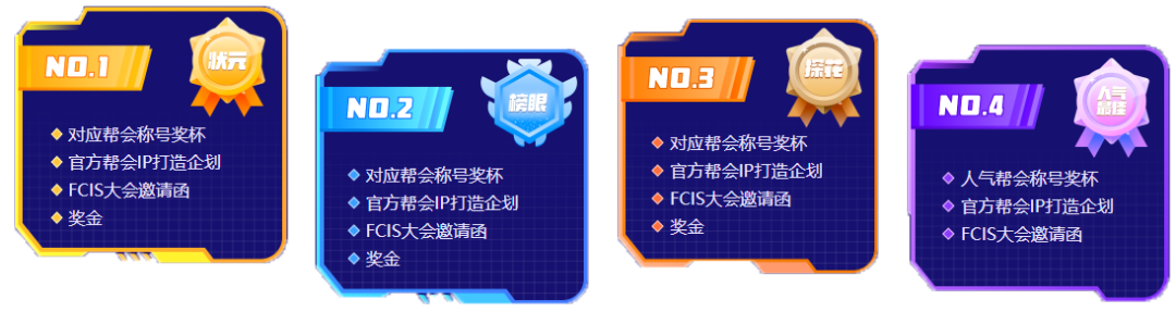第一名——对应帮会称号奖杯+官方帮会IP打造企划+FCIS大会邀请函+奖金