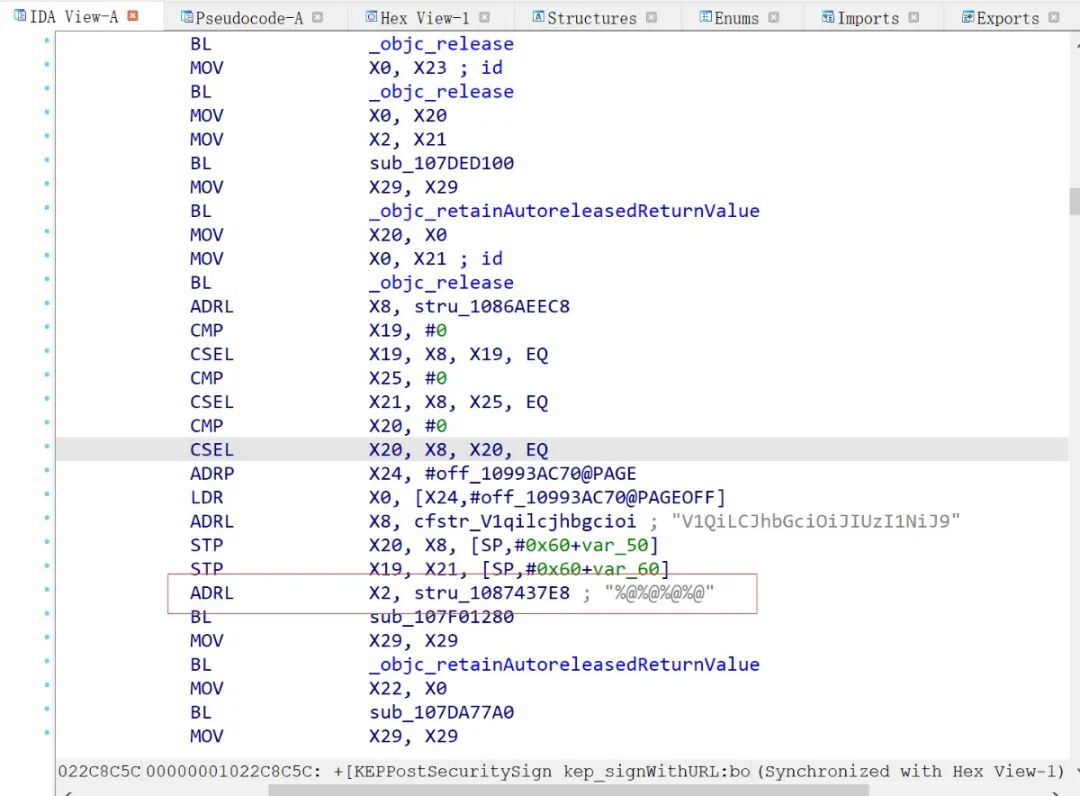 通过MD5的脚本打印,我们也能看到相关的函数调用栈,这对于我们快速定位也提供了很大的方便。我们直接搜索[KEPPostSecuritySign kep_signWithURL: body:]方法,可以看到明显的字符串拼接的痕迹,IDA还是比较智能的,已经识别出了MD5的salt值。
