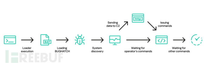 下图是研究人员在被感染的主机上观察到的活动。在Bughatch成功地与C2服务器建立连接后,它将会开始收集网络资源的数据。