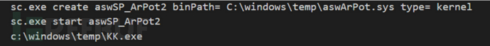 对BAT文件和遥测数据的分析表明,av.bat使用sc.exe实用程序创建了一个名为“aswSP_ArPot2”的服务,在С\windows\temp\目录中指定了驱动程序的路径,并将服务类型指定为内核服务。BAT文件然后在相同的sc.exe实用程序的帮助下启动服务,并运行连接到易受攻击的驱动程序的KK.exe。
