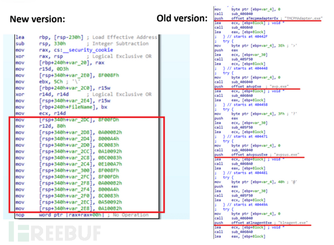如下示例截图所示,新版本中所有关于要终止的进程的数据都是加密的,而旧版本公开显示了攻击者想要停止的所有进程的名称。