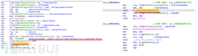 Burntcigar使用DeviceIoContol函数访问易受攻击的Avast驱动程序,指定包含安全问题的代码的位置作为执行选项。这段代码包含ZwTerminateProcess函数,攻击者使用它来终止进程。