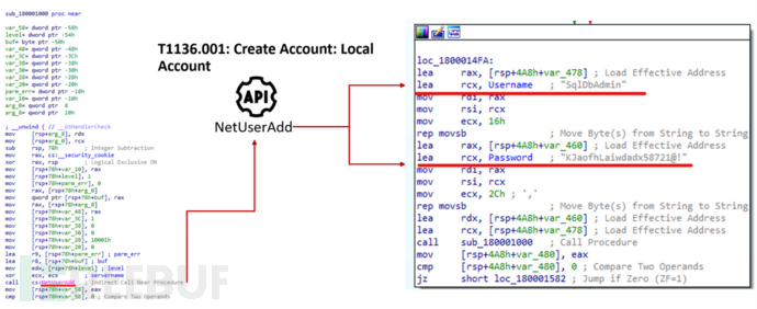 研究人员发现它使用了WIN API函数NetUserAdd来创建用户,且名称和密码在DLL中是硬编码的。
