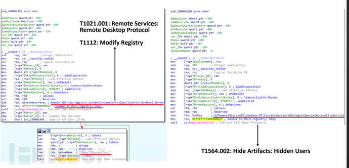 当进一步研究该库时,研究人员发现它使用RegCreateKey函数通过修改注册表设置为新创建的用户启用RDP会话。然后,该库将新创建的用户添加到Special Account注册树中,以便将其从系统登录屏幕中隐藏起来,这是一种有趣且非常规的持久性技术。在大多数情况下,恶意行为者在脚本的帮助下添加新用户,而安全产品很少会遗漏这些脚本。