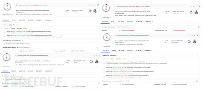 研究人员发现VirusTotal包含Cuba恶意软件的新样本,其文件元数据与上述事件中的相同。其中一些样本成功地躲过了所有网络安全供应商的检测。研究人员对每个样本都进行了分析。从下面的截图中可以看到,这些是使用加密数据来规避反恶意软件的Burntcigar新版本。