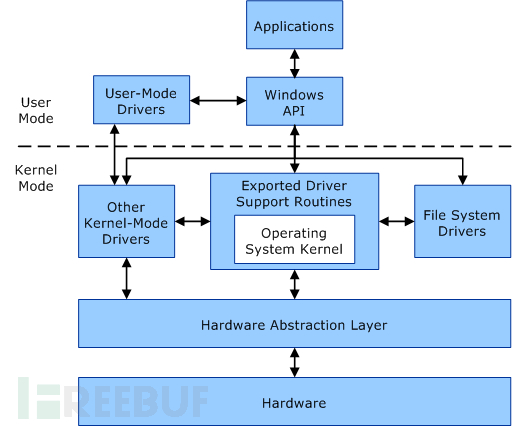 要理解为什么这是最危险的攻击类型之一,就需要快速复习一下驱动程序是什么。驱动程序是一种软件,它充当操作系统和设备之间的中介。驱动程序将操作系统指令转换为设备可以解释和执行的命令。驱动程序的进一步用途是支持操作系统最初缺乏的应用程序或功能。从下图可以看到,驱动程序是介于用户模式和内核模式之间的一层。