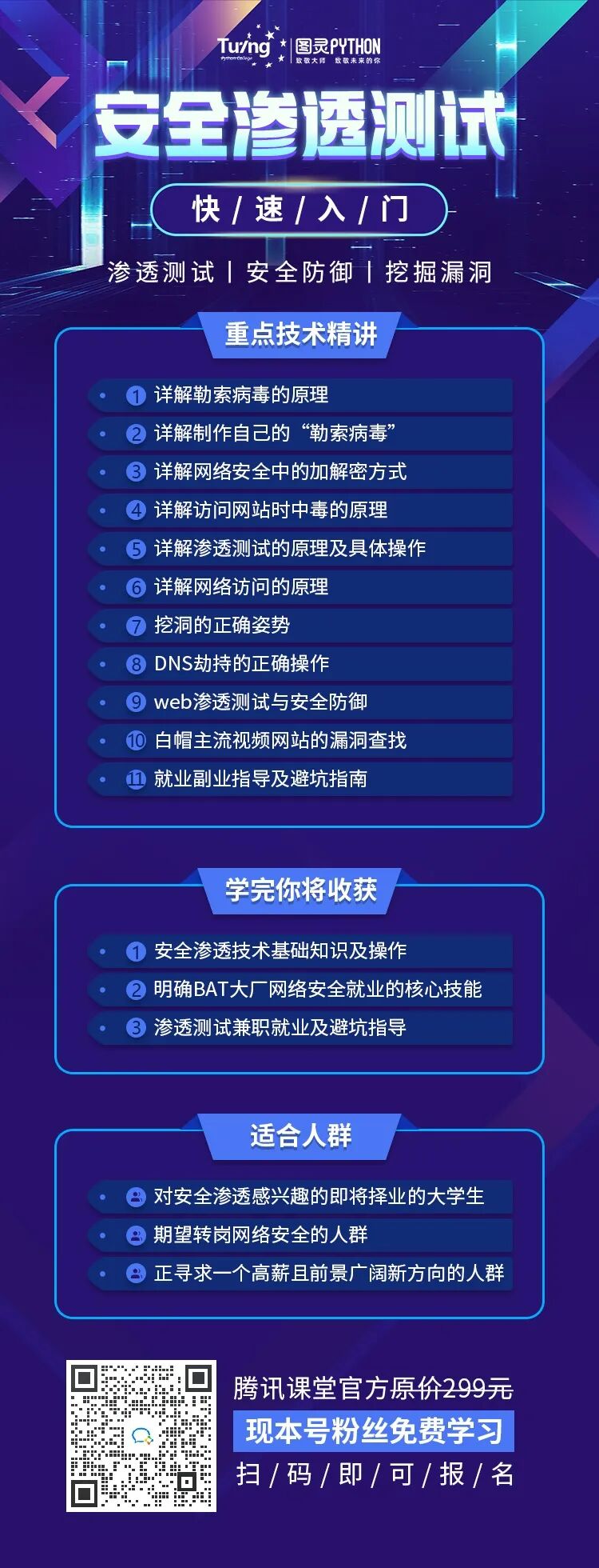 有以上考虑的朋友,可以参考james老师的【渗透测试快速入门】课,课程免费,主讲渗透测试,资料免费,囊括黑客技术,渗透技术,实战演练等模块。