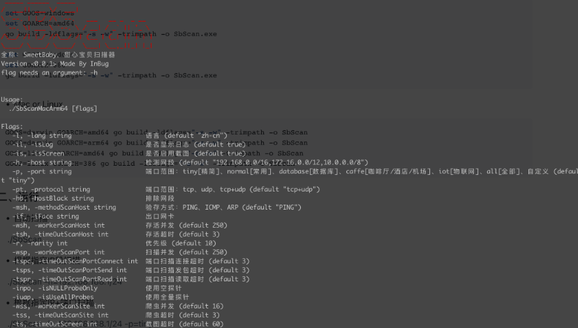./SbScan -wsh=2048 -wsp=1024 -h=192.168.188.1/24,10.0.0.1/16 -p=22,80,443./SbScan -h=192.168.188.1/24 -p=22,80 --nsh --nsp --nsw --nsv./SbScan -h=ip.txt -wp=pass.txt -wu=user.txt -sf=test.xlsx -ssw=redis,ssh,mysql下载地址