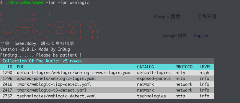 ./SbScan -h 192.168.0.0/16 -wsh 500 --wsp 500./SbScan -h 192.168.188.0/24 -p 80,22,81-89列出weblogic漏洞对应的poc