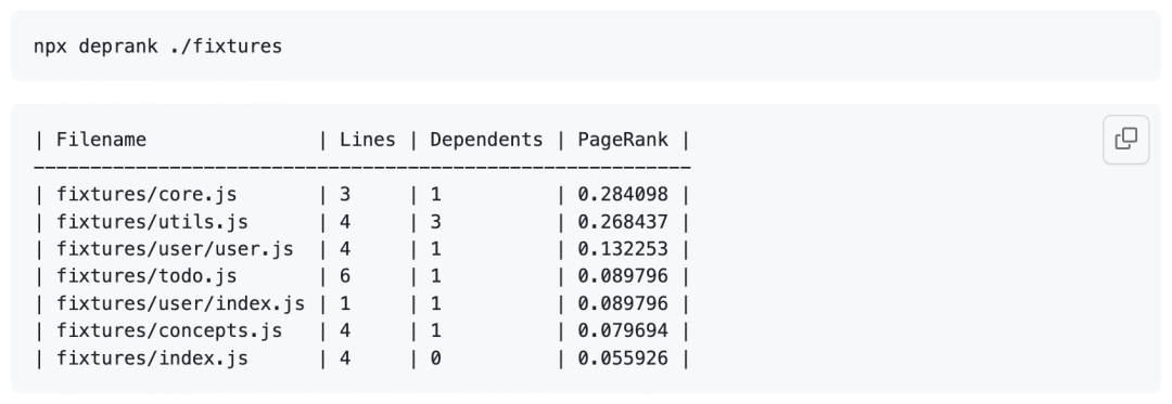 18、deprank:通过 PageRank 找到代码库中最重要的文件。该项目基于 PageRank 算法和源文件依赖关系,找到 JavaScript/TypeScript 代码仓库中被依赖最多的文件。