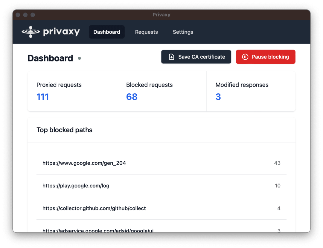 30、privaxy:Rust 写的跟踪和广告拦截工具。该项目基于 MITM 中间人攻击原理,在两端之间建立双向隧道,通过过滤 URL 地址阻止广告的请求,实现拦截广告的效果。它占用内存少、速度快,支持自动更新过滤列表、统计信息显示、自定义过滤列表等功能。
