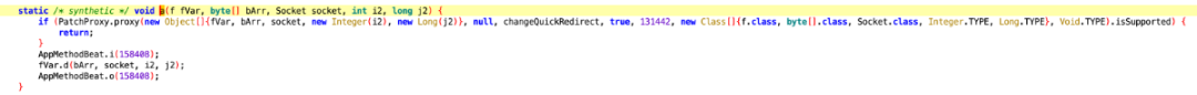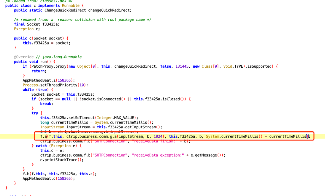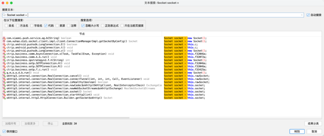 我们推测,Socket一定是要循环来发送接收消息的,所以我们在搜索结果中优先定位在while循环中的Socket实例化的代码。有run()就优先找run函数。