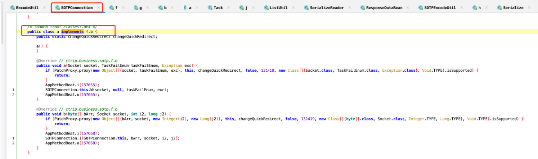 继续深入,到一个接口类,可以用frida来查找实现类,也可以在jadx中搜索:impelements f.b