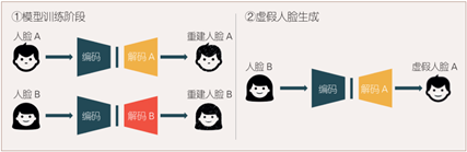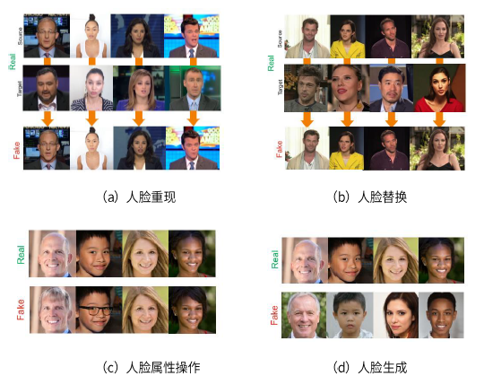 2017年,美国Reddit新闻网站上一位名为deepfakes的用户上传了经过技术篡改的色情视频,将视频中的演员人脸替换成一位电影明星的脸,由此“深度伪造(Deepfake)”技术引发人们关注。深度伪造目前仍然没有公认统一的定义, 美国在其发布的2018 年《恶意伪造禁令法案》中将“Deepfake”定义为“以某种方式使合理的观察者错误地将其视为个人真实言语或行为的真实记录的方式创建或更改的视听记录”, 其中“视听记录”即指图像、视频和语音等数字内容。本文认为深度伪造技术是一种利用深度学习等新兴技术创建或更改图像、视频、语音和文本等数字内容,意图产生误导效果的技术。目前的视频图像深度伪造技术主要源于深度学习技术在计算机视觉方向的应用和发展。伪造生成主要使用深度神经网络有自编码器网络AE(auto-encoder)和生成式对抗网络GAN(Generative Adversarial Networks)两大类。初期视频图像的伪造主要依靠自编码器网络,自编码器网络由一个编码器网络和一个解码器网络组成,编码器通过提取人脸特征将人脸图像进行编码压缩,解码器从压缩的编码表示中重构原始人脸。网络在训练阶段,编码器网络学习捕捉人脸的关键特征,利用对应的解码器网络重构形成学习的人脸图像。伪造生成人脸时,只需将任意人脸输入统一的编码器,再将编码后的人脸通过目标人脸的解码器解码,所生成的人脸图像就会具有目标人脸的特征同时保留输入源人脸的表情、特征属性。自编码器网络为了提高伪造的逼真程度,需要刻意逼近真实样本数据概率分布,造成网络泛化性能不足,生成的逼真程度受限。为了解决这些问题,有研究人员提出使用GAN网络提升伪造生成逼真程度的思路。GAN是一种采用博弈论思路的网络结构,网络由生成模型和判别模型两部分组成,训练学习的过程就是生成器和判别器相互博弈的过程,生成器通过给定输入信息,随机生成样本数据,判别器则要判别生成的样本数据是否属于真实训练样本,两者通过对抗式训练提升其生成器的能力,最终达到生成器能够生成足以“以假乱真”的数据样本。当前主流的视频图像深度伪造技术主要基于GAN网络思路,衍生出多种基于GAN的变种网络,比如去除了池化层的DCGAN网络、引入EM(Earth-Mover)距离的Wasserstein GNA网络、使用两个不同领域图像学习的CycleGAN网络和引入进化策略优化网络的E-GAN网络、利用条件生产对抗网络的paGAN、结合层叠式网络的SCANs和大规模生成对抗网络等,用于对人脸面部表情、特征进行更精细的操作和渲染,以生成更逼真的人脸图像。目前深度伪造视频图像主要表现在人脸部属性的修改或生成,主要分为人脸重现、人脸替换、人脸属性操作和人脸生成四个方面。人脸重现是指使用源身份人物的表情、面部动作、头部及躯体动作驱动目标身份的相应动作,目标身份人脸不变,伪造或迁移特定表情、动作到目标人脸,以实现目标身份表情或动作的伪造。人脸替换就是换脸伪造,是指交换源身份人脸和目标身份人脸,以实现人身份修改的目的。人脸属性操作是指添加、编辑或删除目标身份人脸属性,比如发型、肤色、年龄、种族等,以实现目标身份修改的目的。人脸生成是指使用模型完全创建一整个不存在的人脸图像。图3 深度伪造生成的四种主要形态